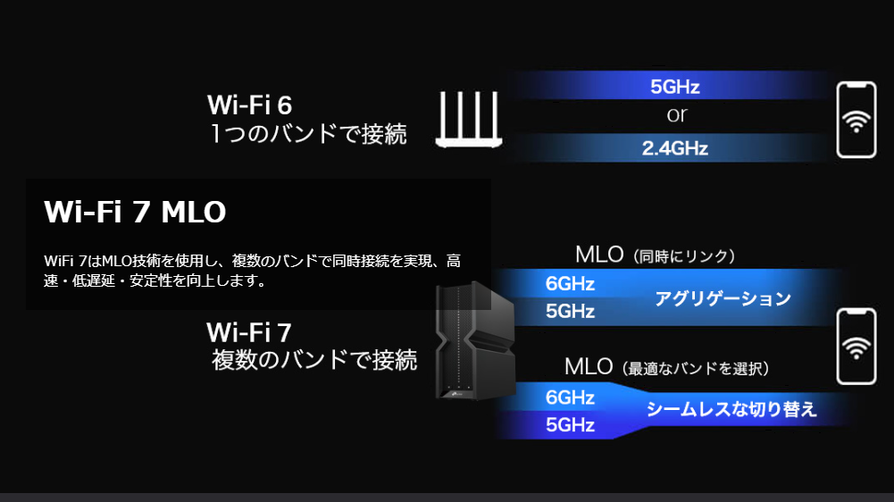 ご安心ください。ここで最新規格 Wi-Fi 7 の出番です。特に注目すべきはMLO(マルチリンク・オペレーション)という技術です。