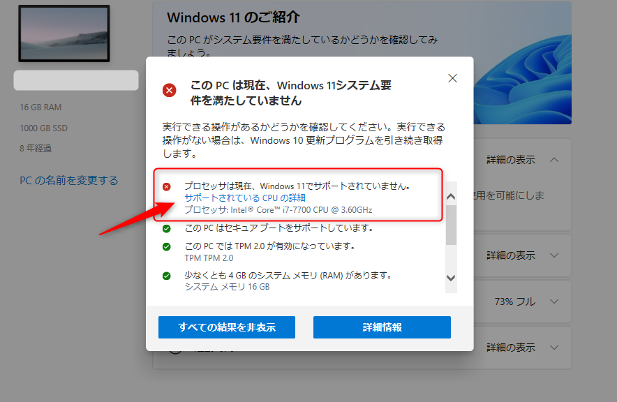このPCではプロセッサがサポートされていないとの事。それなら対応のCPUを見つけて、CPUを乗せ換えればよいのだと考えますが、なにせWindows11に対応できないパソコンですから、かなり以前のものです。ちなみに、今回検証したパソコンは8年経過したコンピュータです。Intel Core i7-7700というもので、Windows11に対応していません。