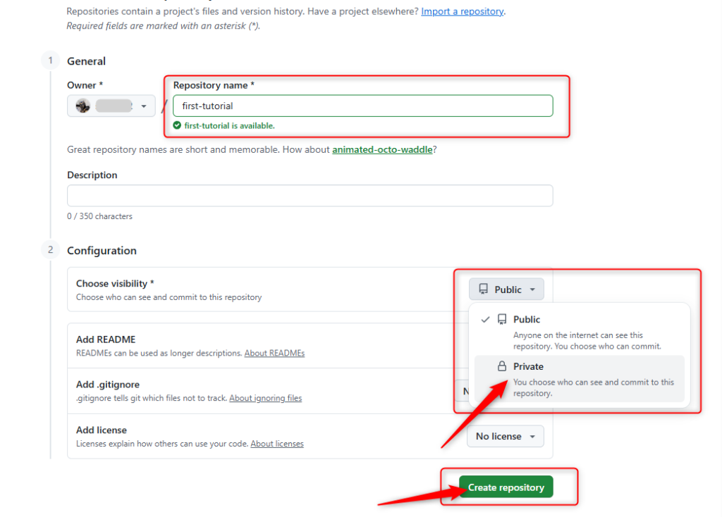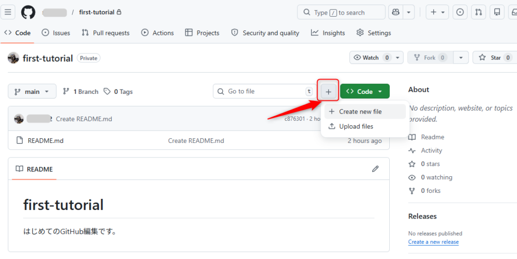 first-tutorial)を入力します。 - Public(公開)か Private(非公開)を選びます。今回は練習なのでPrivateがおすすめです。