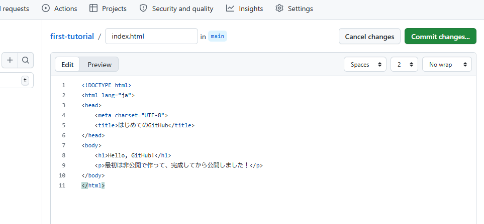 リポジトリができたら、実際のプログラム(今回はWebページを作るHTML)を書いていきます。Privateなので失敗しても大丈夫です!