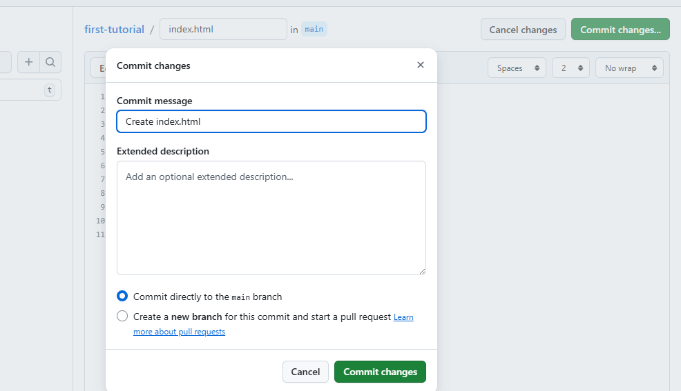 - 画面右上にある緑色の「Commit changes…」をクリックします。
