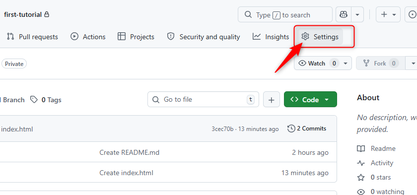- リポジトリ画面上部のタブから「Settings(歯車マーク)」をクリックします。