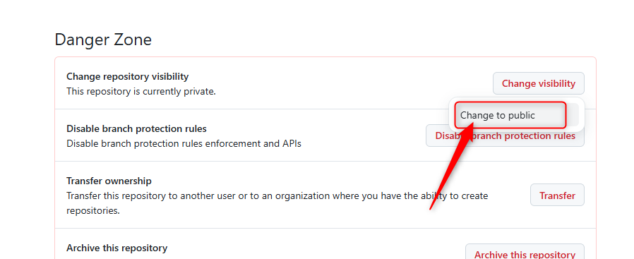 - 「Change repository visibility」の横にある「Change visibility」をクリックし、「Change to public」を選択します。