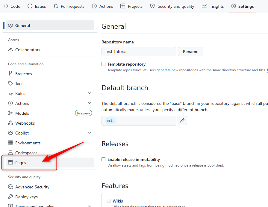 - 引き続き「Settings(歯車マーク)」の画面で、左側のメニューを下へスクロールし「Pages」をクリックします。