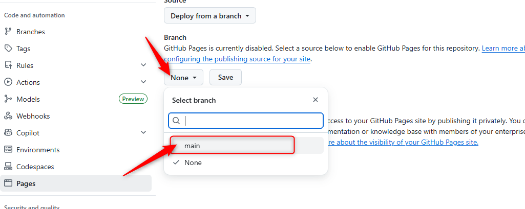 Noneとなっているドロップダウンをmainに変更します。 - 「Save」をクリックします。
