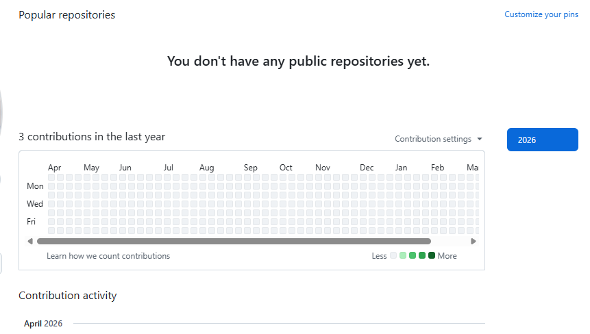 画面の下の方に、緑色の小さな四角が表示されているカレンダーがあるはずです。これは「Contributions(貢献度)」と呼ばれ、あなたがコードをコミットした日に緑色のマークがつきます。