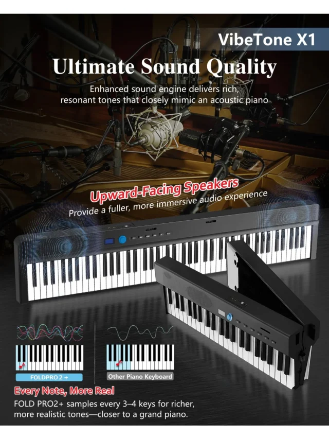 従来の折りたたみピアノは、どうしても「電子音っぽさ」が拭えない課題がありました。しかし、Fold Pro2+は最新のVibeTone X1音源技術を採用。高密度サンプリングにより、ピアノ特有の繊細な強弱や余韻が格段にリアルになっています。