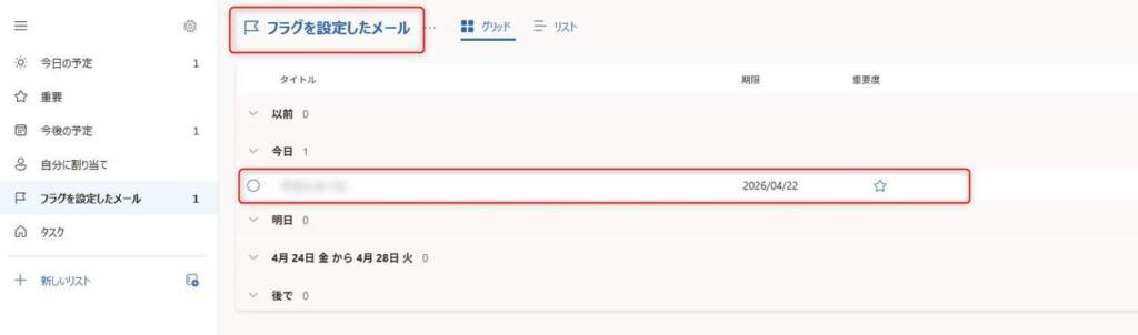 - 先ほどフラグを立てたメールが、タスクとして一覧表示されます。