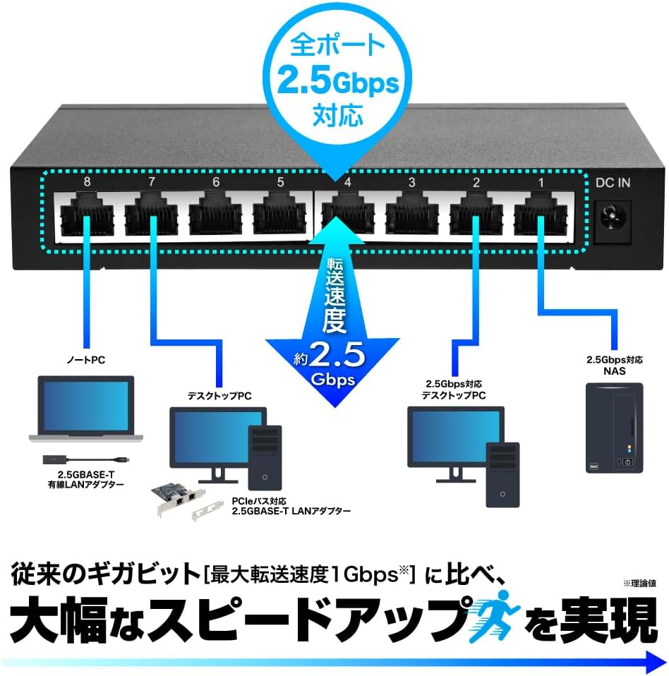 - 10Gbps/2.5Gbps/1Gbps (10000Mbps/2500Mbps/1000Mbps): 現代の標準。大容量の動画ファイルやクラウド上のデータもサクサク動く。