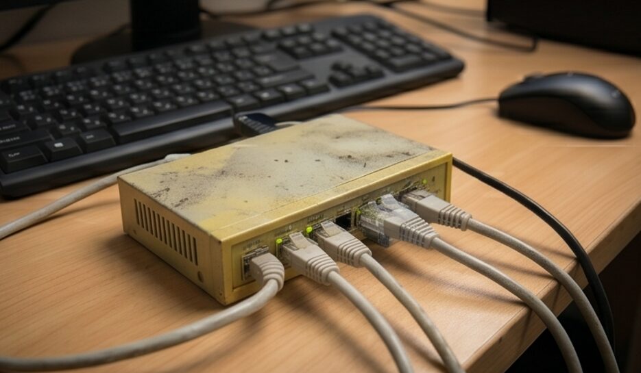 例えば、ある部署の島(デスク)にLANポートが足りなくなり、誰かが昔使っていた古いハブを勝手に持きてきて増設したとします。 壁のLANポートからギガビットでデータが来ても、そのハブを経由してパソコンに繋がっている従業員は、全員100Mbpsの速度制限を受けることになります。「私の席だけネットが遅いんです」というクレームの典型的な原因です。