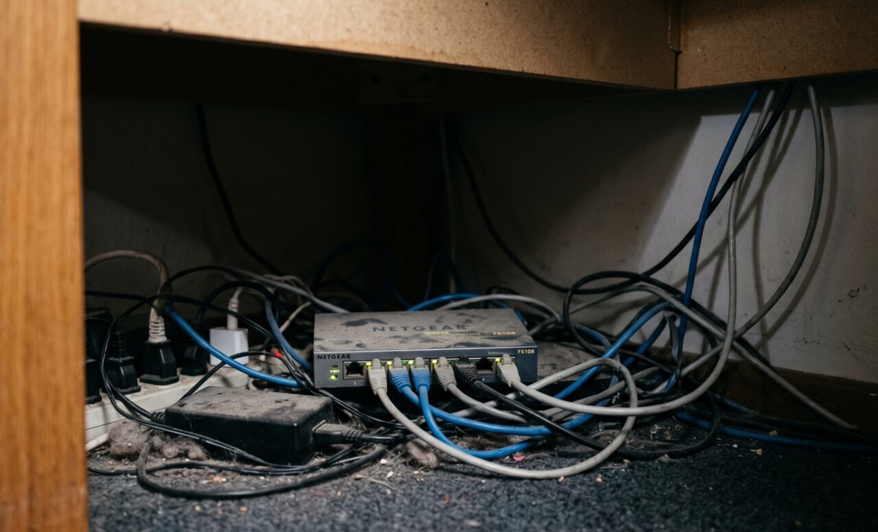 - デスクの下、OAフロアの中を覗く: 「誰かが勝手に持ってきたハブ」は、ホコリまみれになってデスクの裏や足元に転がっていることがよくあります。