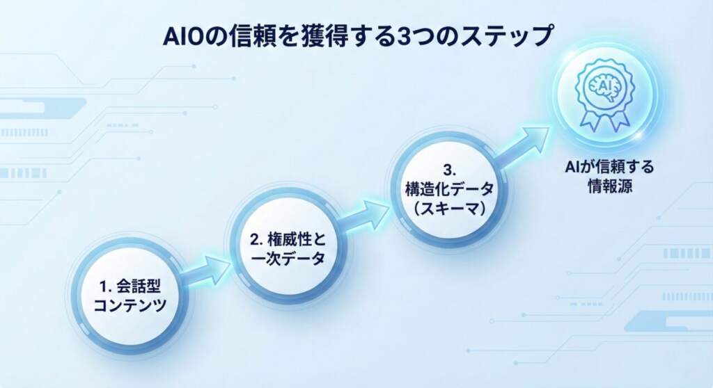 では、具体的にどのように対策すればよいのでしょうか? AIOの本質は、小手先のテクニックではなく「エンティティ(実体)としての信頼性」を高めることにあります。