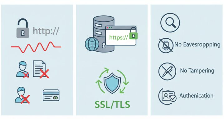 - 盗聴:通信内容を第三者に盗み見られるリスク。SSL/TLSは通信を暗号化することで、万が一データを傍受されても内容を解読できなくします。