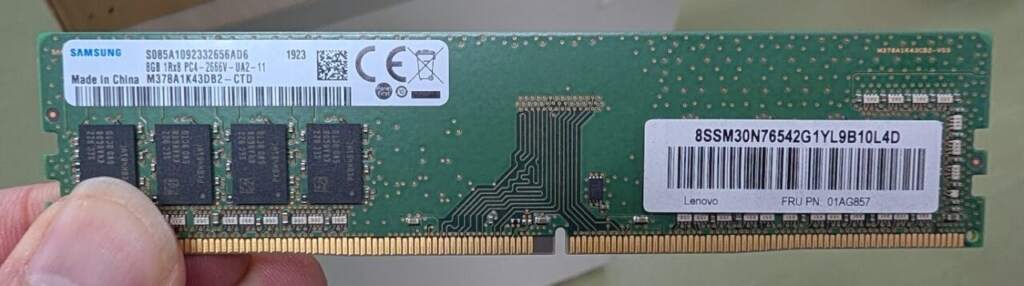 今回のWindows10時代のLENOVOのパソコンは6年前に購入したもので、メモリは8GBのものを搭載していました。例えば、これはSAMSUNGのメモリでPC4-2666Vと書いてありますので、これがメモリの種類になります。正確にはPC4-21300(DDR4-2666)というデスクトップ用のものになります。現在搭載されているメモリの型番を見て自分のものと同じものを探しましょう。
