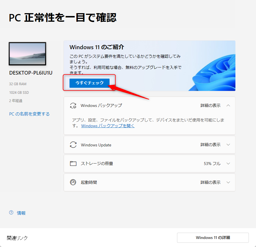 お使いのデバイスでWindows 11を実行できるかを確認するには、アプリ内の [今すぐチェック] を選択してください