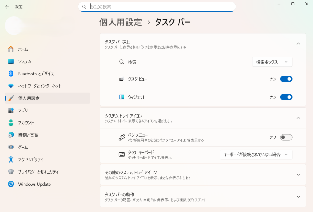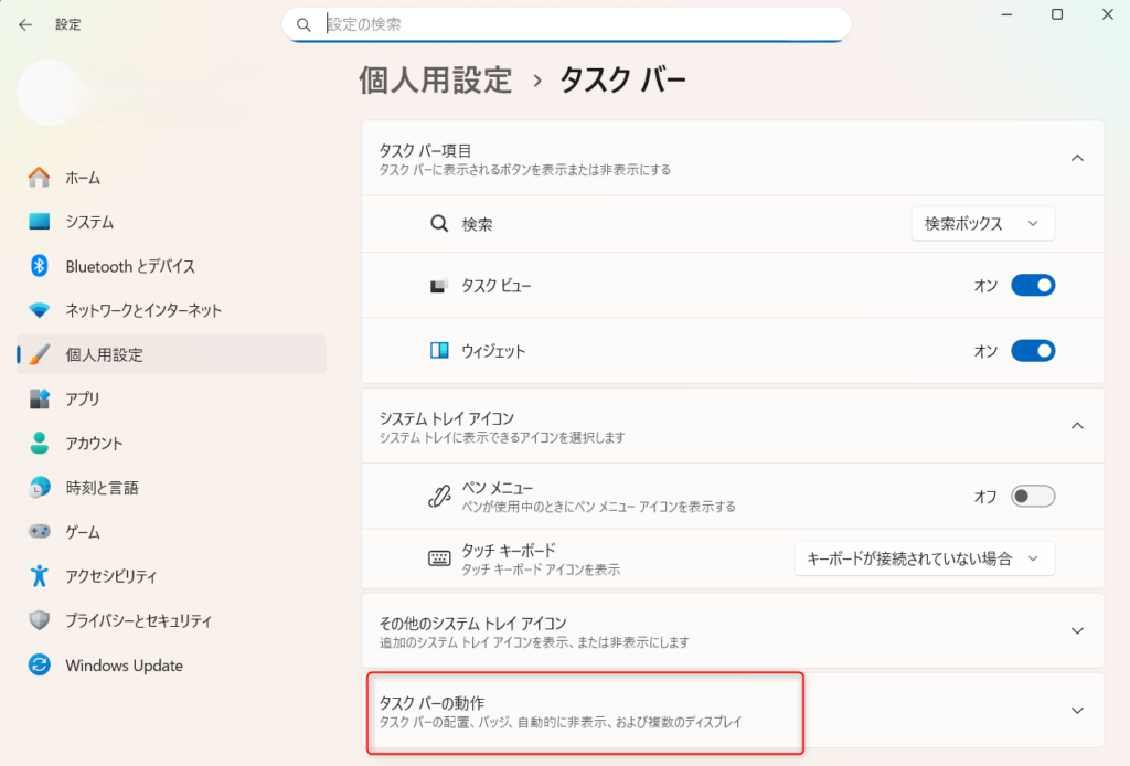 画面を少し下にスクロールすると、「タスクバーの動作」という項目があります。(通常は一番下にあります) この項目をクリックして、設定内容を展開してください。