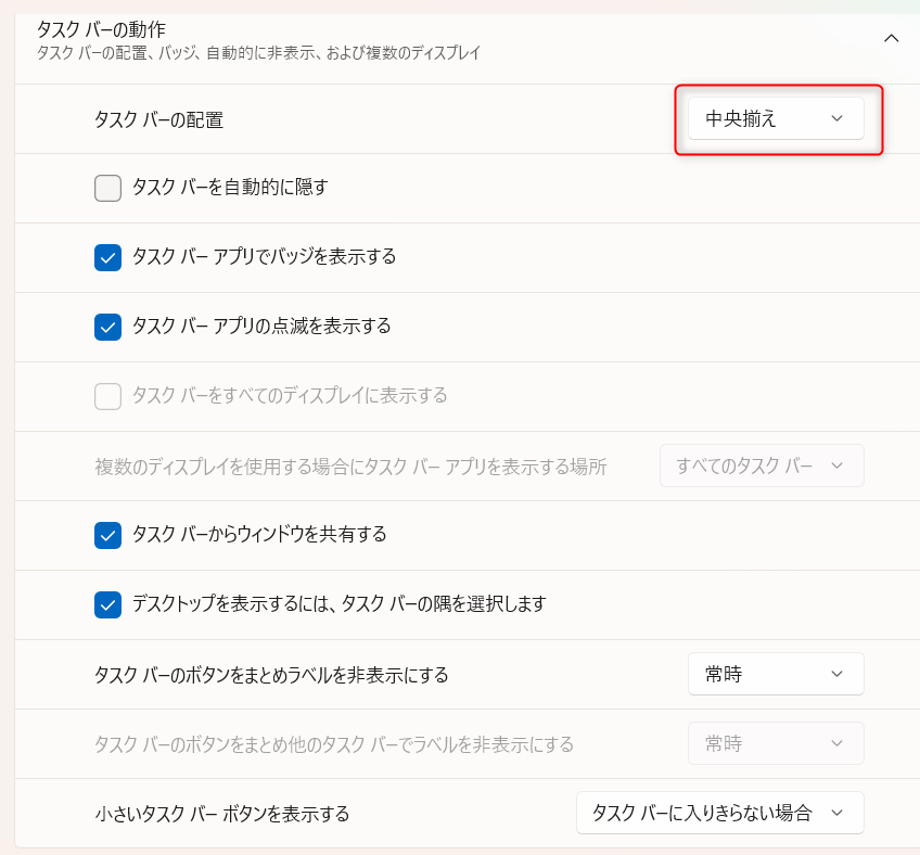 「タスクバーの動作」をクリックすると、一番上に「タスクバーの配置」という設定項目が見つかります。
