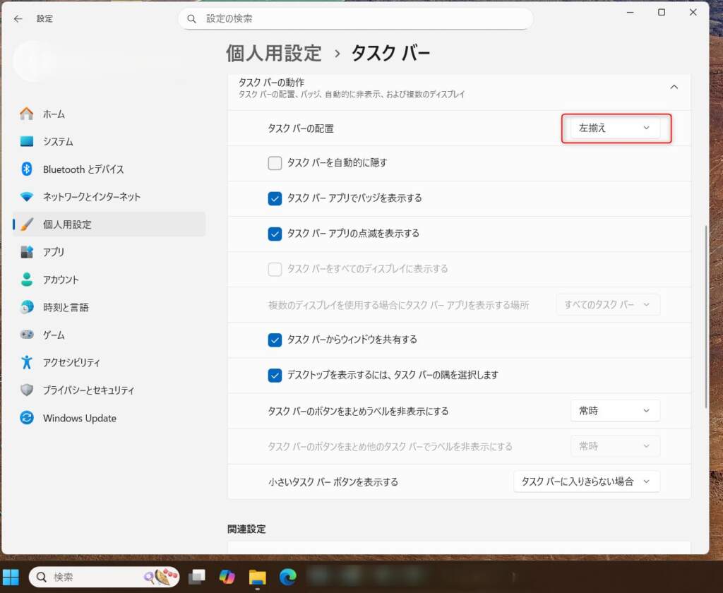 ステップ3:「タスクバーの配置」を「左揃え」に変更する