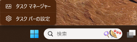 まずは、画面下部のタスクバー(アイコンが並んでいる帯状の領域)の何もないところを右クリックします。